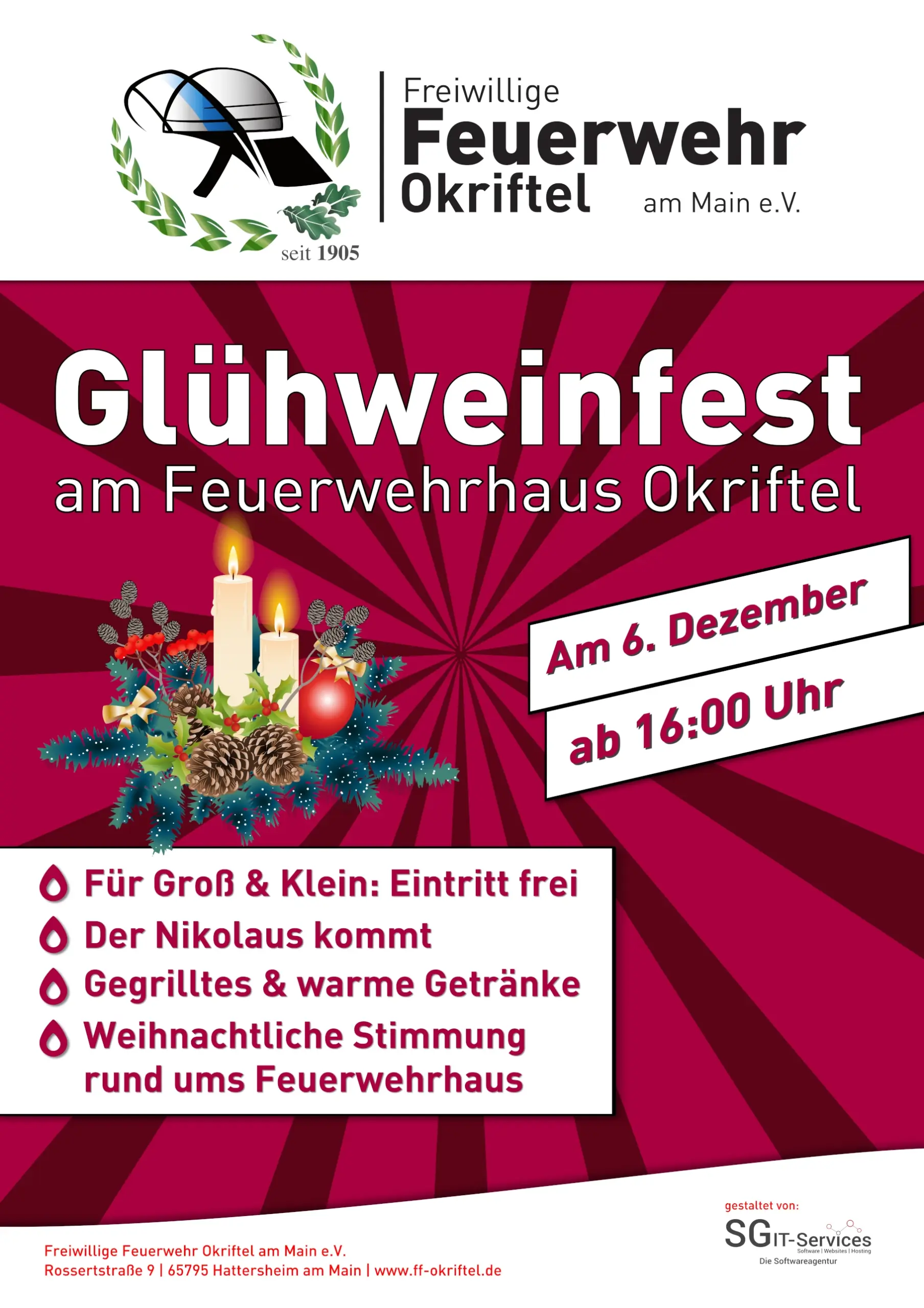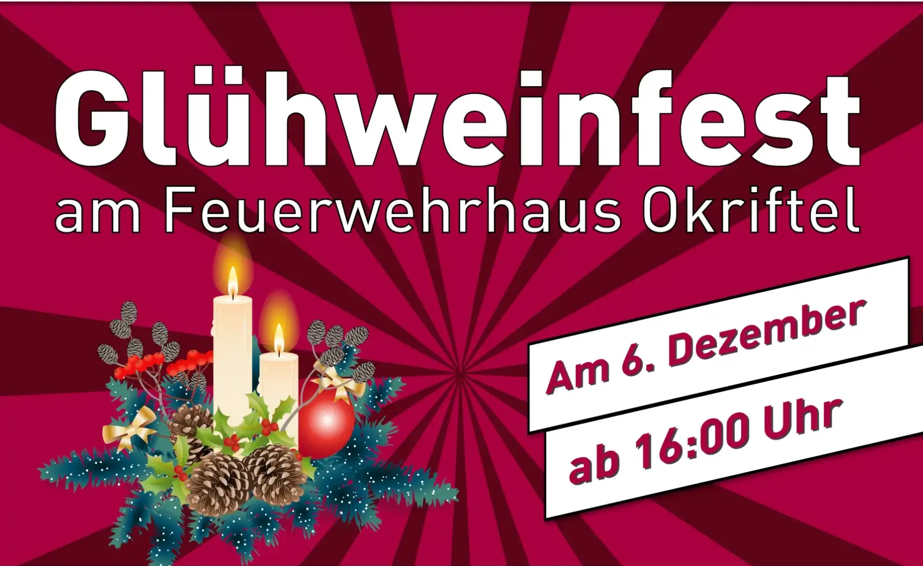 Feiert mit uns die Vorweihnachtszeit beim Glühweinfest der Okrifteler Feuerwehr! 🎉 Wir erwarten euch am 06. Dezember ab 16 Uhr im Feuerwehrhaus Okriftel zu einem gemütlichen Abend mit Leckereien vom