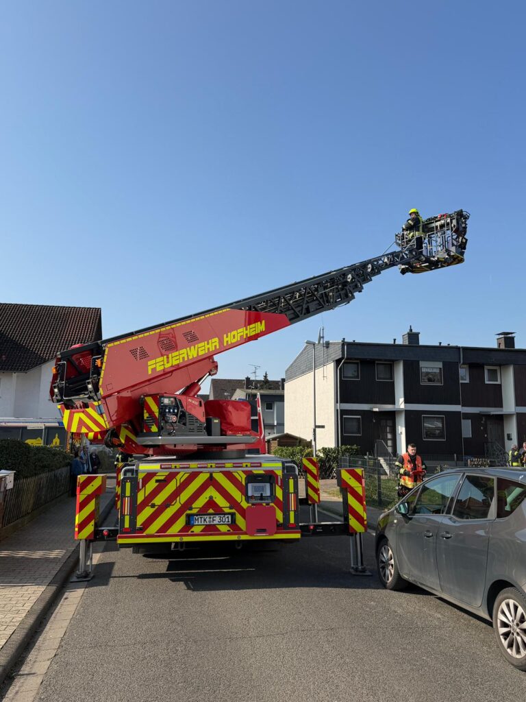 Der Rettungsdienst forderte uns zu einem laufenden Einsatz nach. Über die Hofheimer Drehleiter wurde eine verletzte Person aus dem ersten Obergeschoss gerettet. Die Hattersheimer Feuerwehrkräfte unterstützten dabei. Nachdem der Patient in den Rettungswagen verbracht war, konnten wir unseren Einsatz beenden.