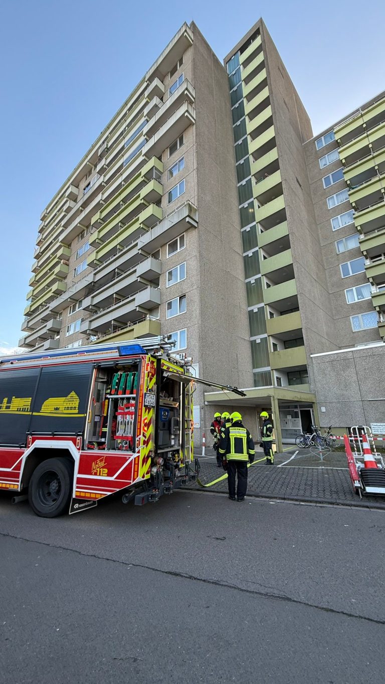 Aufgrund einer ausgelösten Brandmeldeanlage wurden wir am Sonntag alarmiert. Nachdem wir im 6. Obergeschoss des Wohnhochhauses Brandgeruch feststellten, erhöhten wir das Alarmstichwort auf „F2 – Gebäudebrand“. Damit wurden Kräfte des Rettungsdienstes nachalarmiert.