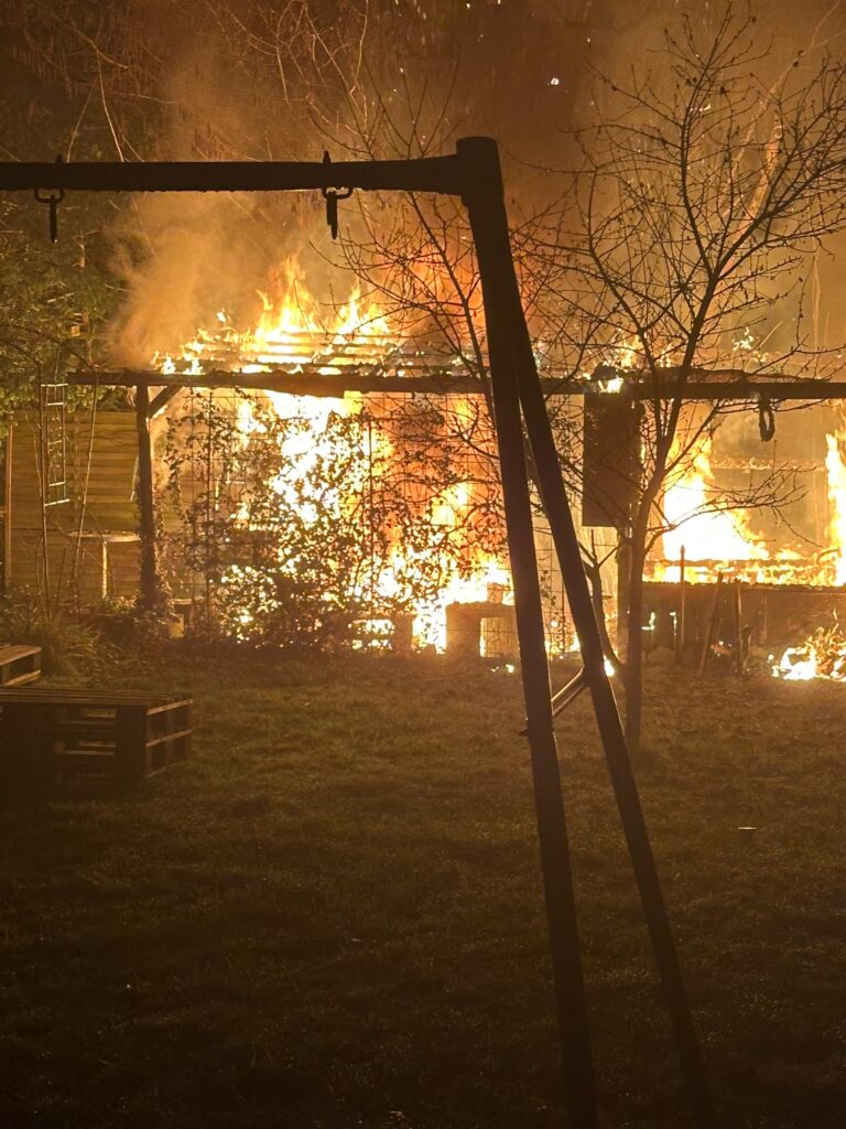 Wir wurden Freitag Nacht um 3 Uhr zu einer brennenden Gartenhütte im Bereich des Okrifteler Wehrs alarmiert. Bereits auf der Anfahrt über die Beethovenstraße war für die ersten Kräfte ein Feuerschein sichtbar.