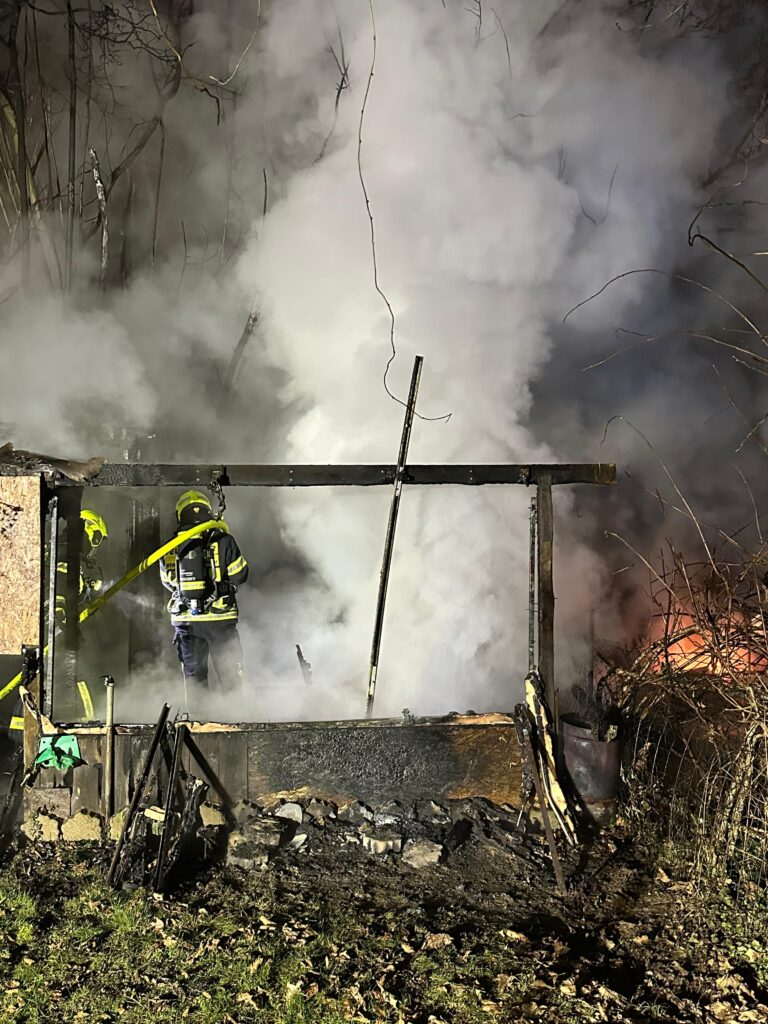 Ein Trupp unter Atemschutz hat eine brennende Gartenhütte mittels C-Strahlrohr abgelöscht und im Nachgang mit der Wärmebildkamera kontrolliert.