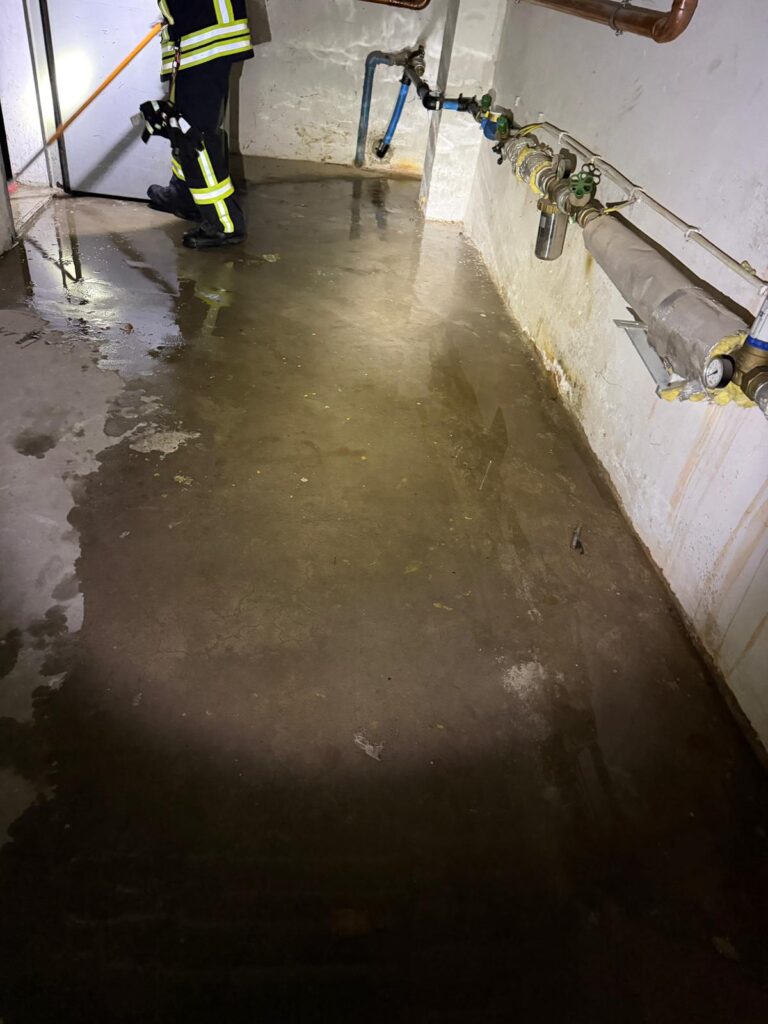 Wir haben die Wasserzufuhr zur Wohnung und im Verlauf zum Gebäude abgeschiebert, um den Wasseraustritt zu stoppen. Zusätzlich haben wir den Notdienst der Stadtwerke Hattersheim zur Einsatzstelle gerufen. Im Verlauf des Einsatzes mussten auch Teile der Stromversorgung im Gebäude abgeschaltet werden und die Wohnung, sowie 2 Kellerräume mit mehreren Wassersaugern von Wasser befreit werden.