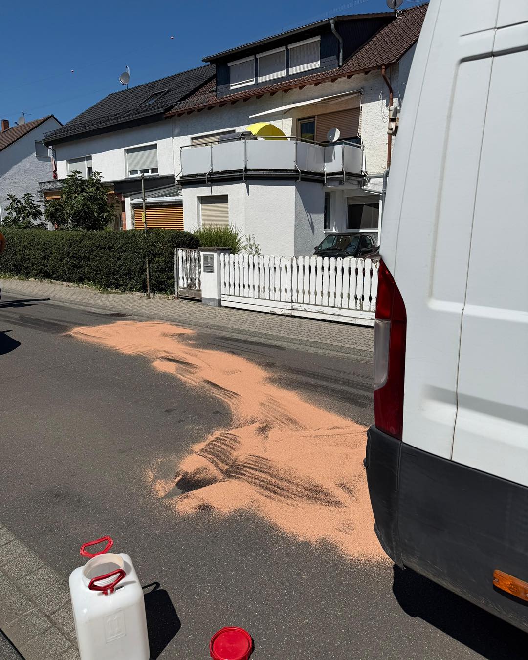 Aus einem Fahrzeug liefen größere Mengen Diesel aus. Mit Bindemittel streuten wir die Ölspur ab.